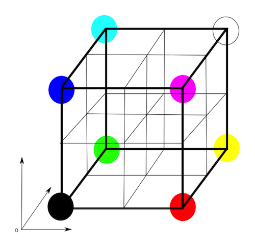 The cube is divided into 8 areas. Each area is tangent with one of the following colours: black, red, green, blue, cyan, magenta, yellow, and white. Now we count the number of points in each area. The resulting numbers are depicted in the histogram.