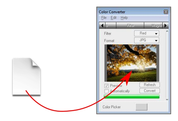 To speed up conversion if you want to convert many files at once, you can turn of the Preview option. Without this option, the previews will not load, which saves some time. If you are going to drop many pictures onto the Color Converter window one by one, then you probably will want to turn on Automatically, which saves you the trouble of clicking on the Convert button.